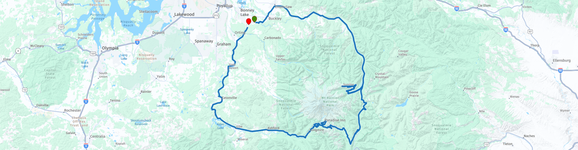 Inizia e termina in South Prairie questo viaggio di 183 miglia offrirà viste sempre diverse sul Monte Rainier e su molte altre cime all'interno del Parco Nazionale.