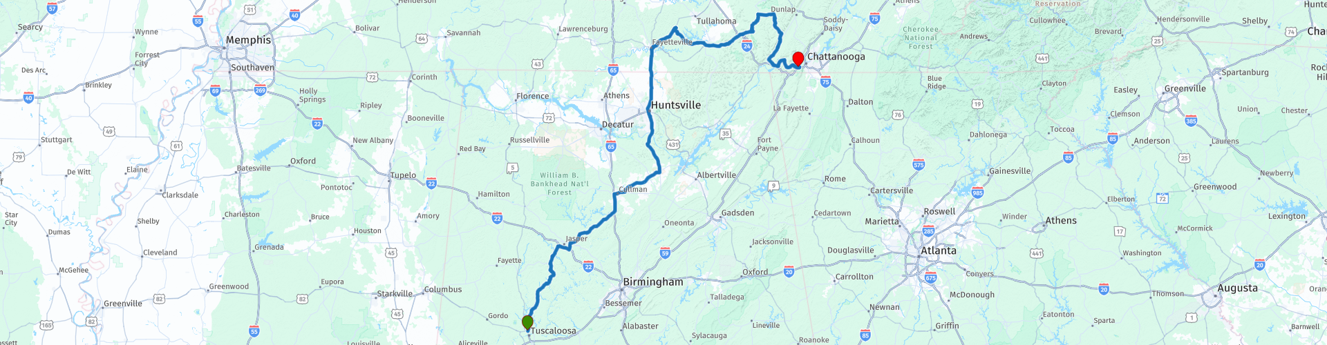 Auf dieser 4-Sterne-Route fahren Sie auf schönen guten Straßen, auf denen Sie natürlich eine Flasche Jack Daniel's in der Distillery kaufen müssen.