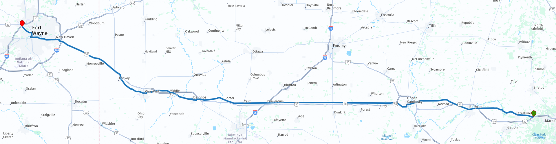 Crossing the state line, you leave Ohio and enter Indiana, where the journey continues to Fort Wayne.