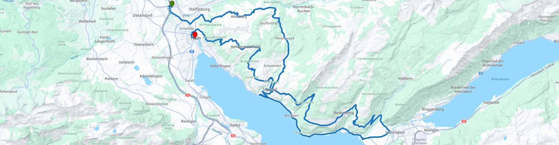 The last 20 kilometers take us past the rehabilitation center in "Heiligenschwendi" and back to Thun. Attention from "Heiligenschwendi" there is a bus. Since the cures are sometimes very narrow, the bus comes towards you on the side of the street.