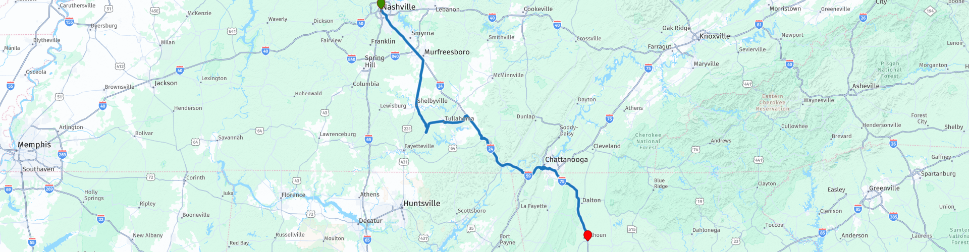 Leaving Chatanooga the final part of the day is the journey to Calhoun, Georgia. Today has been about easy riding and ionic destinations. Time can be split with less in Lynchburg and more in Chatanooga if preferred.