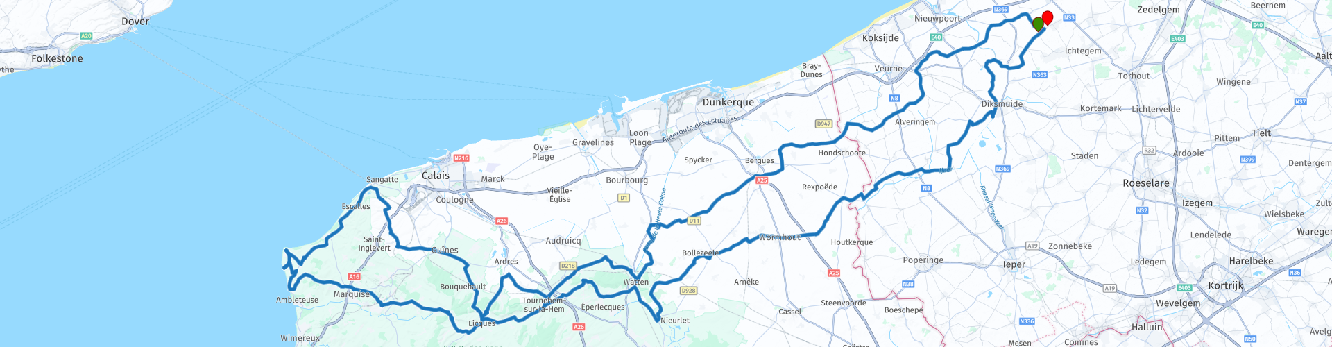 Dit is de lange route van 2016, 302 km tot aan de Franse kustlijn en terug. Een weekendje kan natuurlijk steeds, genoeg overnachtingsmogelijkheden in de Franse kustdorpen. De route kreeg 4 sterren, mede door de mooie uitzichten op de 2 caps.