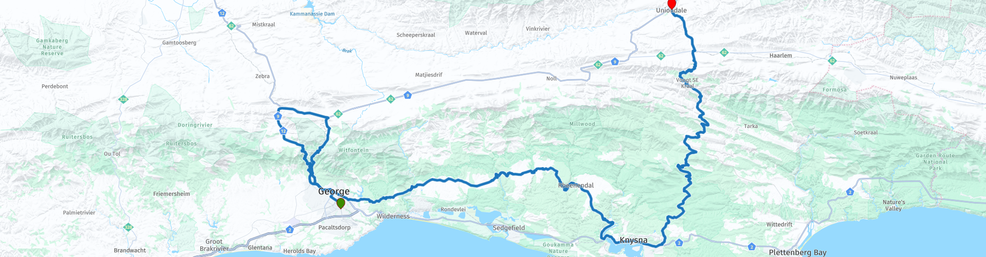 Dit is een mooie rit van George via een aantal prachtige, uitdagende onverharde bergpassen met uitdagende bochten naar Uniondale. Het is een rit van ruim 226 kilometer.